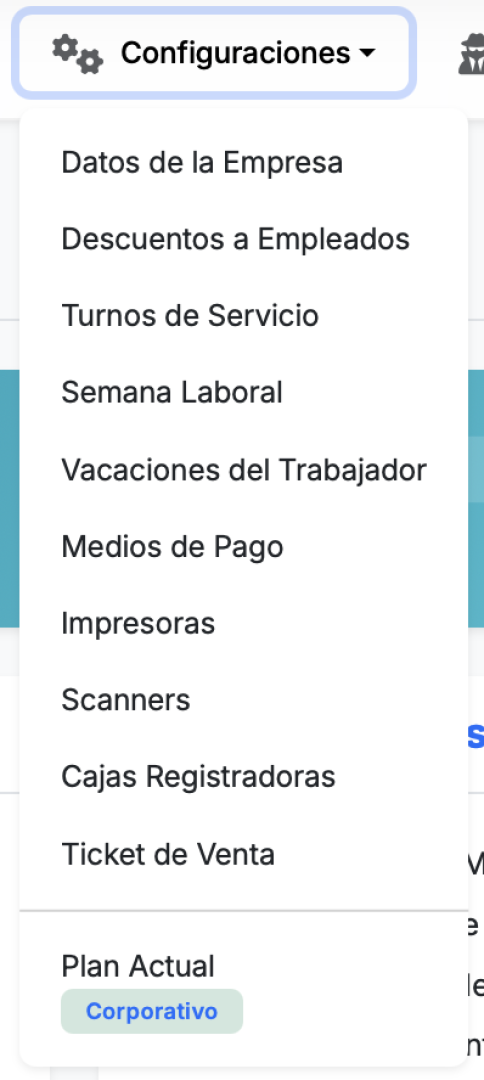 Configuraciones: Registro y manejo de todas las configuraciones generales del sistema, desde los datos de la empresa, registro de semana laboral, impresoras y configuraciones de tickets de venta. Así como la vista del plan contratado actualmente.